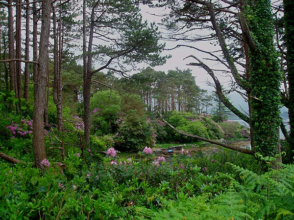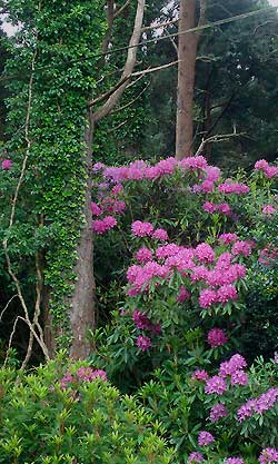Wilder, in den schillernsten Farben blühender Rhododenron wuchert zwischen den Bäumen und bildet zusammen mit dem Efeu eine undurchdringliche Wand mit einer Höhe von bis zu 6 Metern.