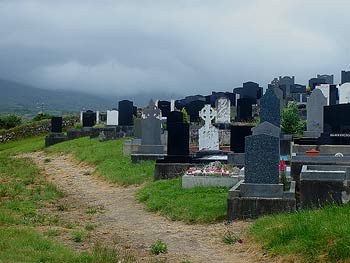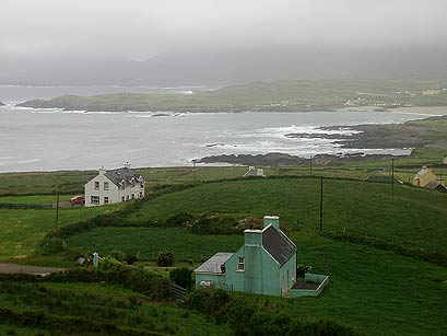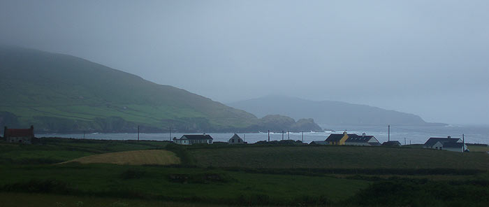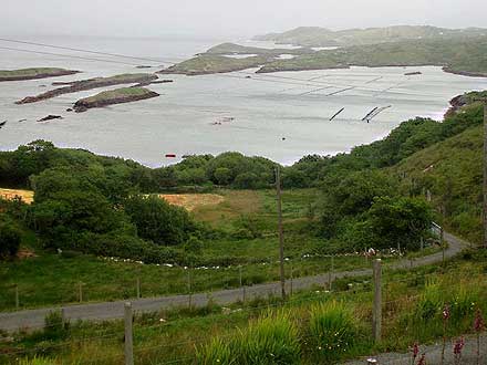 Am nächsten Morgen lächelt die Sonne freundlich zum Fenster hinein. Das ist für uns das Zeichen, aufzubrechen. Zunächst einmal radeln wir die 4 Kilometer zurück bis zur Hauptstraße, und dann geht es weiter am Meer entlang. Fast auf Meeresniveau und ohne sonderliche Steigungen radeln wir bis nach Ardgroom. Mir fallen auf dem Weg bis dorthin die zahlreichen Bojen im Meerwasser auf. Ich glaube, daß die Fischer ihre Netze ausgebreitet haben und diese daran befestigt haben. Mittlerweile sind wieder dunkle Wolken aufgezogen und es sieht nach weiteren Regenschauern aus. Das ist das Irland, wie ich es kenne. Manchmal kommt der Regen so schnell, daß man nicht einmal die Zeit hat, seine Regensachen anzuziehen ohne dabei nass zu werden. Und fünf Minuten später scheint wieder