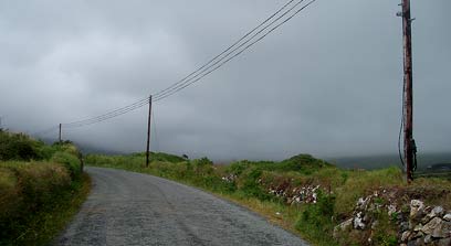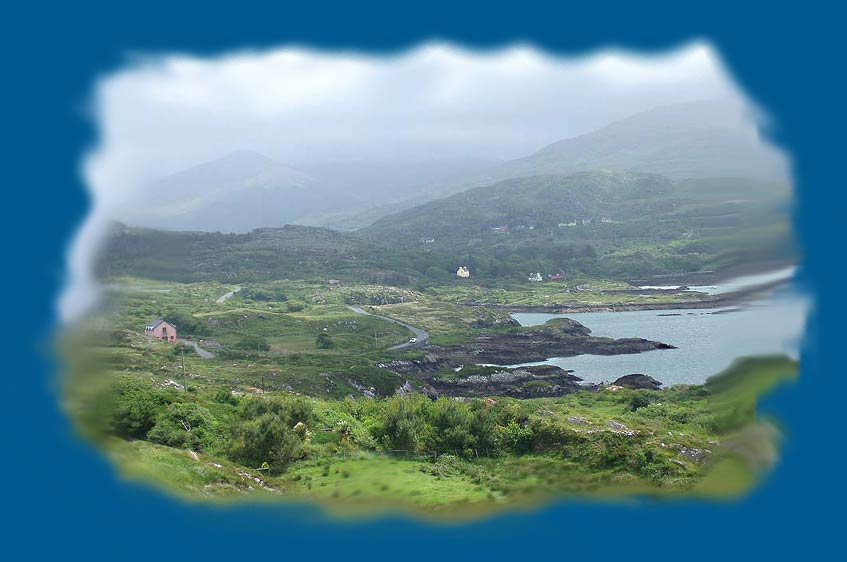 das Land, und im nächsten Augenblick ist der Himmel so schwarz, daß man meinen könnte, der Weltuntergang stünde bevor. Je nachdem wie die Sonne scheint, werden die Schattenbilder von den dunklen Wolken auf die Berghänge projieziert. Fast gespenstisch huschen sie dann von einem Hang zum andern. Wenn der Wind noch dazu heult im Einklang mit dem Rauschen des Meeres, und die Pfützen auf den Straßen anfangen zu dampfen, dann bekomme ich eine richtige Gänsehaut. Es ist ein unbeschreibliches Gefühl, welches mich in dieser einsam, wildromantischen Landschaft befällt. Tief überwältigt von seiner Herrlichkeit macht sich dann eine Art von Melancholie inmir breit. Je weiter wir Richtung Inselspitze fahren, umso dramatischer wird die Landschaft. In Ardgroom, einem kleinen Ort mit ein paar Häusern und einer Tankstelle, verlassen wir wieder die