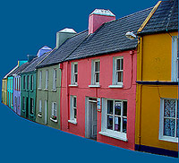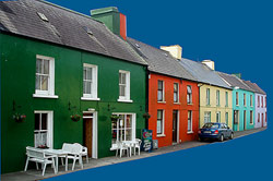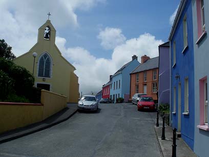 Nach fünf Kilometern tauchen die ersten bunten Häuser von Eyeries auf. So richtige Muße haben wir aber nicht, um uns diesen farbenfrohen Ort anzuschauen. Ein Einheimischer gibt uns den Tip, das 7 Kilometer entfernte Castletownbere aufzusuchen, weil es nur dort die Möglichkeit gibt, das Fahrrad reparieren zu lassen. Zum Glück gibt es auf dem Weg bis dorthin nur eine einzige langezogene, aber nicht allzu starke Steigung, sodass Susanne ein vorsichtiges Radeln mit dem angebrochenen Pedalarm riskieren kann. Als wir die höchste Stelle