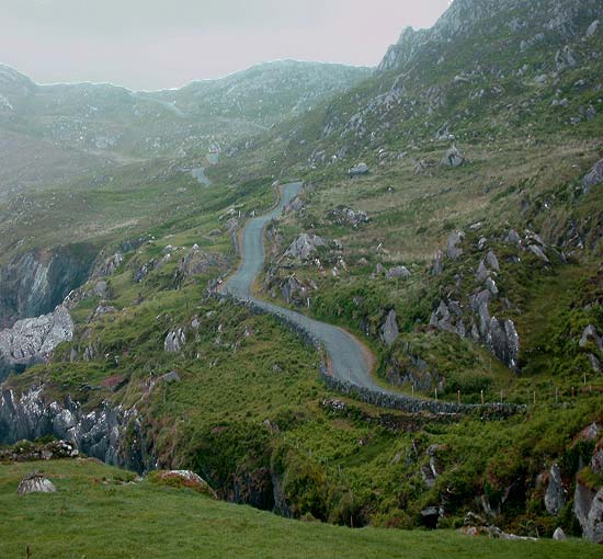Hauptstraße und befahren eine Nebenstraße, die am Meer entlangführt. Dieser stark zerklüftete Streckenabschnitt gehört für mich mit zu den schönsten auf Beara. Allerdings braucht man eine gute Kondition. Permanent geht es hoch und runter. Die Steigungen sind zwar nicht so hoch, dafür aber umso steiler. Sechzehn Prozent sind dabei keine Seltenheit. Bei den Abfahrten auf dem sehr rauhen, mit Schlaglöchern garnierten Asphalt, müssen wir höllisch aufpassen, damit wir nicht stürzen. An Abwechslung ist die Strecke kaum zu