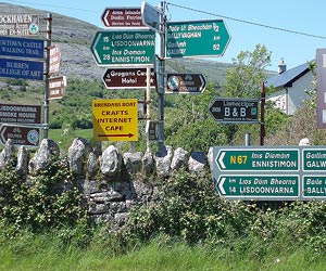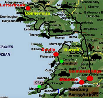 Zurück in die Gegenwart! Pünktlich um 23.15 Uhr berührt unsere Maschine irischen Boden. Am Schalter von “National Car” erhalten wir den Fahrzeugschlüssel, und wir fahren mit dem Leihwagen zum nächst gelegenen Hostel in Sixmilesbridge, welches circa 15 Kilometer entfernt liegt. Die Leute dort wissen über unsere späte Ankunft Bescheid, und auf Anhieb finden wir den Türschlüssel in dem vorher ausgemachten Versteck, denn alles schläft schon. So auch wir, circa 15 Minuten später... Am nächsten Tag gehts weiter. Nach Absprache dürfen wir die Fahrradpacktaschen für die nächsten 3 Wochen in dem Hostel unterbringen. So brauchen wir sie später auf unseren Rädern nicht zu transportieren. Auf kleinen Straßen fahren wir zunächst einmal nach Galway. Grüne Hecken umsäumen die Straßen und teilen die leicht wellige Landschaft in Parzellen ein. Ganz typisch für diese Gegend!