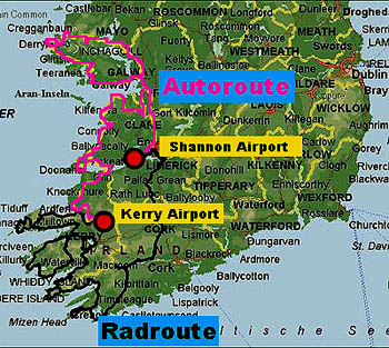 Endlich ist es soweit! Mit dem Flugzeug fliegen wir vom 40 Kilometer entfernten Flughafen in Weeze bis nach Shannon in Irland. Die demontierten Fahrräder haben wir in spezielle Packtaschen verpackt, weil dies neuerdings Vorschrift ist. Doch was tut man nicht alles, wenn man für so wenig Geld verreisen kann. Denn bei Ryanair haben wir insgesamt nur160 Euro für 2 Rückfahrkarten, inklusive der Fahrradmitnahme und der anfallenden Steuern bezahlt. Über Internet hatten wir ebenfalls schon einen Kombi gebucht,damit wir darin unsere Fahrräder unterbringen können, die ja später noch zum Einsatz kommen, wenn wir den Leihwagen nach drei Tagen am Flughafen Kerry, in der Nähe unseres Zielgebiets abgegeben haben.
