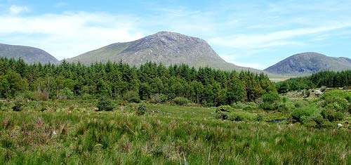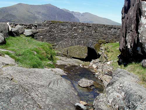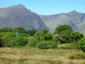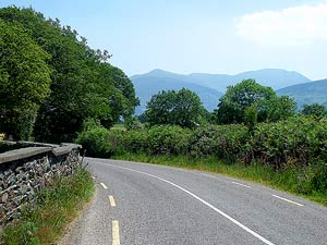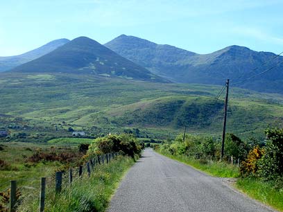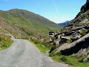 Wir sind hinter Killorglin, und vor uns hat sich das Macgillycuddygebirge wie eine große Wand aufgebaut. Es geht nun stetig in weiten Bögen bergauf. Doch der Steigungsgrad ist erträglich, und somit werden wir auf sanfte Art in eine bezaubernde Bergwelt eingeführt. Die letzten