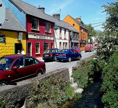 Die in einem Talkessel eingebettete Landschaft ist für die nächsten Kilometer leicht wellig und äußerst abwechslungsreich. Nicht zuletzt auch wegen dem hier bestehenden Wald- bestand, den es in Irland ja kaum gibt. Nachdem wir einen weiteren Pass überwunden haben, näher wir uns allmählich der Südküste. Vor uns, weiter unterhalb, liegt das blaue und glitzernde Meer mit dem Touristenort Sneem, eine Anlaufstation für sämtliche Reisebusse auf dem Kerryway. Wir trinken zwischen kitschigen Andenken- läden einen Kaffee und stellen fest, daß der Touristentrubel für uns ein wenig gewöhnungsbedürftig ist.Wir lassen Sneem hinter uns und radeln weiter auf der