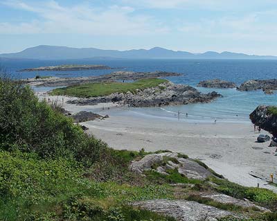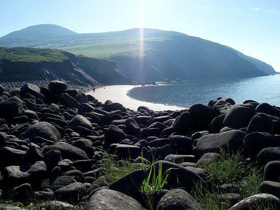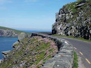 fantastisch schönen Küstenabschnitt an der Spitze der Halbinsel Dingle. Eng schmiegt sich die Küstenstraße an die steilen Berghänge, die in den Atlantik eintauchen. Ein Meerespanorama löst das andere ab, und zwischen schroffen Felsen und saftigem Grün liegen traumhaft schöne weiße Sandstrände. Wir passieren einige prähistorische Hütten. Auffällig ist auch das Restaurant, ganz aus Stein gebaut.