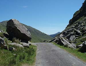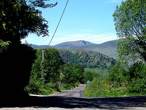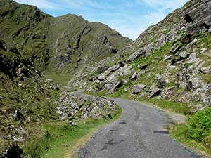 2 Kilometer bis zum Paß sind allerdings recht mühselig und sehr steil. Dazu kommt noch die Hitze, die zwischen den kargen und reflektierenden Felswänden nicht entweichen kann. Umso schöner ist es, alswir den höchsten Punkt erreicht haben. Eine rasante Abfahrt steht uns zunächst bevor. Ein Bergsee fliegt an uns vorbei, und dann taucht unser Sträßchen in einen dunkelgrünen, schattigen Wald ein. Wir befinden uns nun im Landesinnern, welches ich jedem Kerrybesucher wärmstens empfehlen möchte.