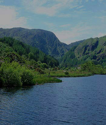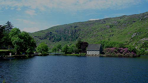 in Deutschland. Eine alte, mit Efeu bewachsene Steinbrücke führt uns über den River Lee, der bei weitem nicht mehr soviel Wasser führt. Bis zur Quelle kann es nicht mehr so weit sein! Richtig vermutet, denn nach einer halben Stunde taucht der Gougane Barra auf. Dieser dunkle Gebirgssee, aus dem der River Lee entspringt, liegt still eingebettet in der irischen Bergwelt. Wie verzaubert schmiegt sich ein Kirchlein ans Seeufer, und steil erheben sich die grünen Hänge der Shehy Mountains aus dem Wasser. Wir haben unser Zielgebiet, den Nationalpark, erreicht! Eine kleine Asphaltstraße soll uns nun im stetigen Auf und Ab durch die