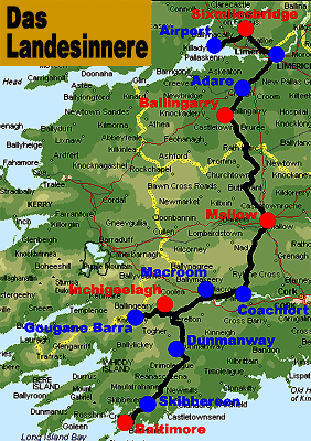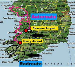von Limerick.Zwischen Baustelle, Preßlufthammer und aufgerissener Straße nähern wir uns inmitten einer stinkenden Autoschlange dem Zentrum. Schön ist die ausge- prägte Hafen und Industriestadt wahrlich nicht! Einen richtigen Stadtkern können wir auch nicht ausfindig machen. Überhaupt, die ganze Stadt scheint eine große Baustelle zu sein, denn überall wird etwas aufgerissen oder neu gebaut. Nachdem wir den Shannon River überquert haben, wird es allmählich ruhiger. Irgendwo, an einer Tankstelle schlingen wir ein Sandwich mit Ei und Speck herunter und schlürfen anschließend einen heißen Automatenkaffee. Es wird nun wieder ländlich, und wir radeln auf den heckenumsäumten Straßen, die so typisch sind für die Umgebung hier in