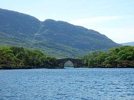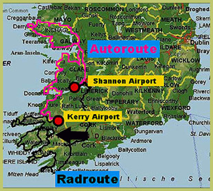 gesamten Landschaft um Killarney herum einnehmen. Aus diesem Grund müssen wir den ersten Teil bis zum Castle auch an der stark befahrenen Nationalstraße entlangfahren. Umso erholsamer ist dann der Weg, der endlich von der Hauptstraße wegführt. An der Burg liegt eine Anlegestation für Schiffe. Dabei erfahren wir, daß zweimal täglich ein Kahn mit Außenbordmotor über sämtliche Seen bis in die Nähe des Gap of Dunloe fährt. Fahrradmitnahme ist möglich! Sofort haben wir einen Plan für den nächsten Tag, nämlich eine Rundtour per Boot und Rad zu unternehmen.