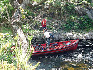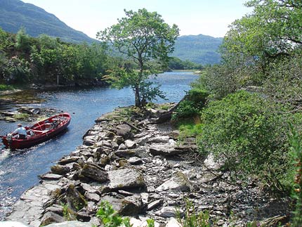 höher kommt und somit nicht auf den Boden schlägt. An einer schwallartigen Flußenge steigen wir aus dem Boot, damit wir es treideln können. Schließlich nach 1,5 Stunden erreichen wir den Bootsanleger in der Nähe von Cap of Dunloe. Eine tolle Bootsfahrt geht zu Ende!