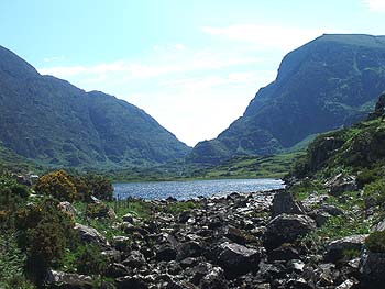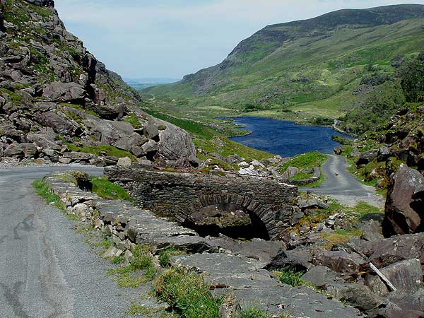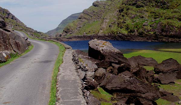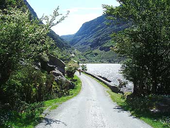 Während die Insassen von unserem Boot in hölzernde Karren umsteigen, die von Eseln zum Pass hochgezogen werden, schwingen wir uns auf unsere eigenen Esel aus Aluminium, Draht und Speichen. Es geht nun ständig bergauf, und schon bald liegt die Seenplatte in Miniaturansicht hinter uns. Noch eine gemeine Steigung, und wir erreichen den höchsten Punkt. Was nun folgt ist einfach atemberaubend schön! Durch eine Schlucht mit riesigen Felsbrocken auf leuchtendem Grün schlängelt sich unser Sträßchen von einem Bergsee zum anderen. Wie auf einer Perlenschnur sind sie auf unterschiedlichen Höhenebenen aneinandergereiht und mit einem kristallklaren Bach verbunden. Nach einer vielleicht 6 Kilometer langen Abfahrt auf der Paßstraße sind wir wieder auf der Ebene auf dem Weg nach Killarney. Wir sind froh, diesen Tagesausflug gemacht zu haben...