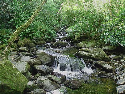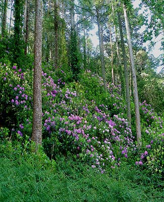 kündigt sich ein Wasserfall durch sein Rauschen an. Wir gehen an dem munter plätschernden Bach vorbei und erreichen die Stelle, wo er vielleicht aus 50 Meter Höhe in die Tiefe schießt. Vorbei an Berghängen, wo zwischen den Bäumen üppig wilder Rhododendron wächst, schraubt sich nun die Straße in Serpentinen immer höher. Einen schönen Ausblick auf die