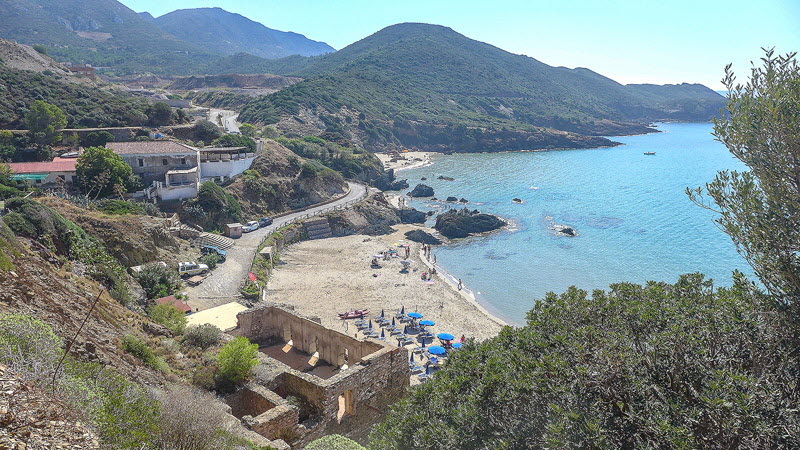 Der Blick von oben verdeutlicht, daß der Strand aus mehreren kleinen Buchten besteht. Im Hintergrund sieht man das ehemalige Bergwerk von Masua.