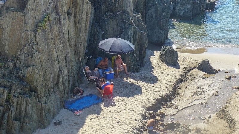 Eine Familie hat sich im Schatten einer Felsgruppe niedergelassen. Diese Stelle ist noch umso schöner weil genau hier über einen Wasserfall ein kl. Bach ins Meer mündet.
