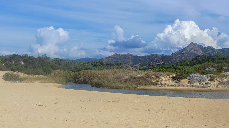 Ein Bach mit glasklarem Wasser kommt von den Bergen und taucht am Strand von Porixeddu auf.