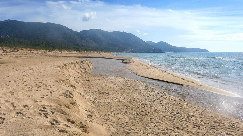Die Strömung von dem Bach hat sich einen Weg durch den Sandstrand gesucht, um ins Meer zu gelangen.