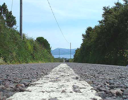 man erst gar nicht in eine gefährliche Situation kommt wie in dem Bild links, wo an einer stark befahrenen Nationalstraße weder Seitenstreifen noch Ausweichmöglichkeit besteht. Vielleicht noch einen Rat zum Schluß! Ich würde mir vor der Irlandtour neue Reifen auf die Räder ziehen, denn der Asphalt, wie man auf dem Foto sieht, ist ziemlich rauh, so sehr, daß man unterwegs das Gefühl hat, permanent abgebremst zu werden.