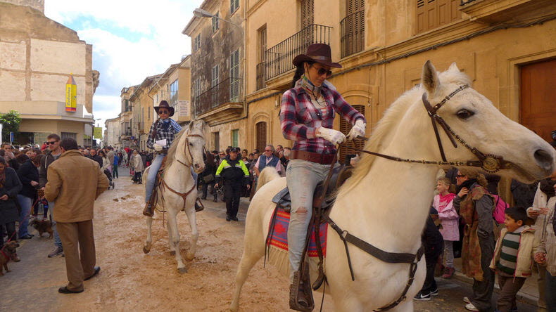 In Westernmanier nähern sich diese Reiter dem Kirchenportal. Viele Menschen haben sich hier versammelt.