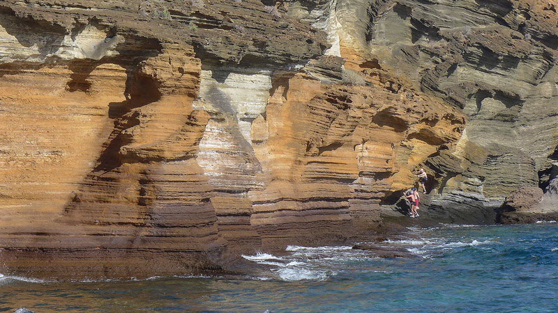 Die Felsformationen können nur bei Ebbe passiert werden. An der Felswand kann man deutlich den Wasserstand der Flut ablesen. Die Ebbe hat eingesetzt doch für mich ist das Wasser noch zu hoch.