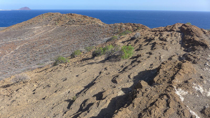 Ich wandere am Kraterrand entlang. Auf dem schmalen Grad zwischen Atlantik und Vulkantrichter pfeift ein kräftiger Wind. Landeinwärts sehe ich noch weitere kleinere Vulkane in einer steppenartigen Landschaft.