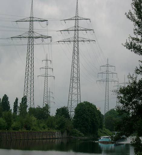 Die vielen Hochspannungsmasten sehen aus überdimensional große Kunstwerke.