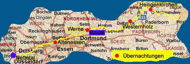 Über Kempen, am Hülser Berg vorbei, erreiche ich Moers. Von hier ist es nicht mehr weit bis zur Rheinbrücke. Die ersten 50 Kilometer sind geschafft, und ich habe noch 35 Kilometer Ruhrgebiet vor mir. In der Nähe von Gelsenkirchen übernachte ich bei einem ADFC-Dachgeber. Dort wartet man schon auf mich.