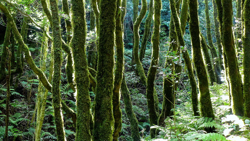 Auf dem Weg zurück wird der Nebelwald stellenweise von Licht durchflutet. Das Sonnenlicht reflektiert an den äußeren Moosschichten der Bäume und verzaubert den sonst so dunklen Nebelwald.