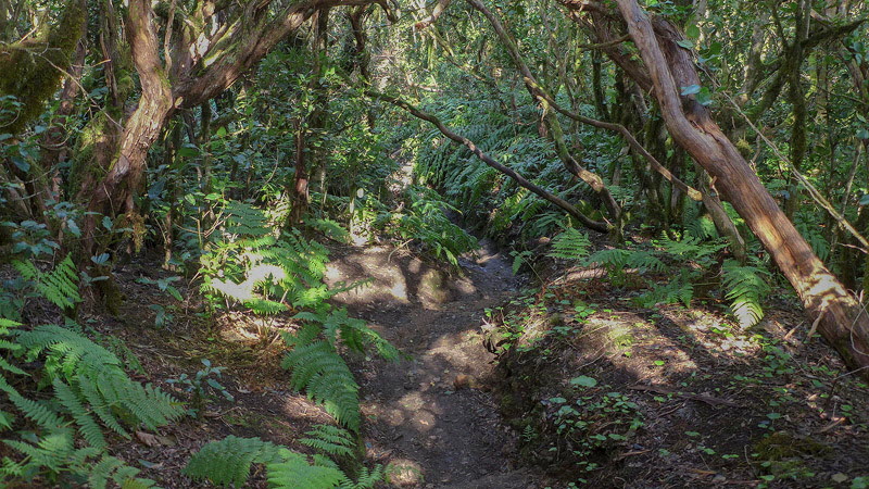 Ein schmaler Pfad schlängelt sich durch urwaldähnliches Gelände.