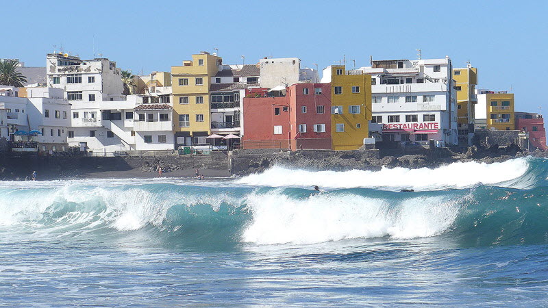 Der mächtige Atlantik schiebt eine Welle nach der anderen an den Traumstrand Jardin.Hinter blauen Wellenkämmen heben sich die bunten Häuser von Punta Brava ab.