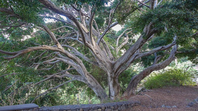 Auf dem Weg nach unten passieren wir einen riesigen indischen Loorbeerbaum, dessen Äste sich weit in alle Richtungen verzweigen.