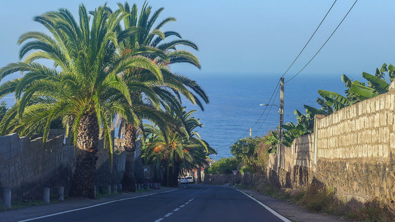 Zwischen ummauerten Bananenfeldern führt eine Stichstraße zielstrebig zum Meer herunter.
