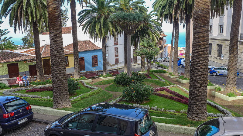 Eine der zahlreichen Grünanlagen inmitten der Stadt, hier an der Hauptkirche von Orotava.