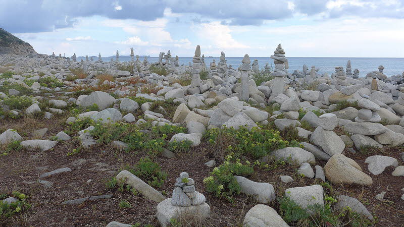 Ein Feld von Steinmännchen entdecken wir an einem alten Steinbruch ganz in der Nähe.
