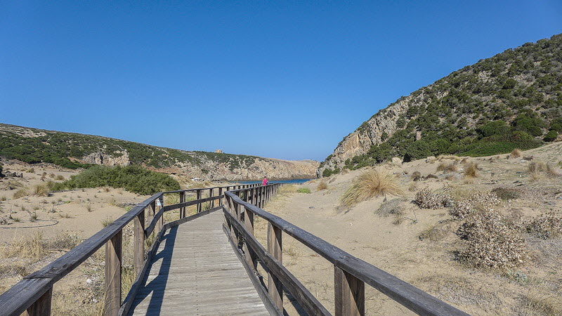 Etwas südlich liegt der Strand Cala Domestica. Von dem Parkplatz aus führt ein Plankenweg zu diesem Kleinod.