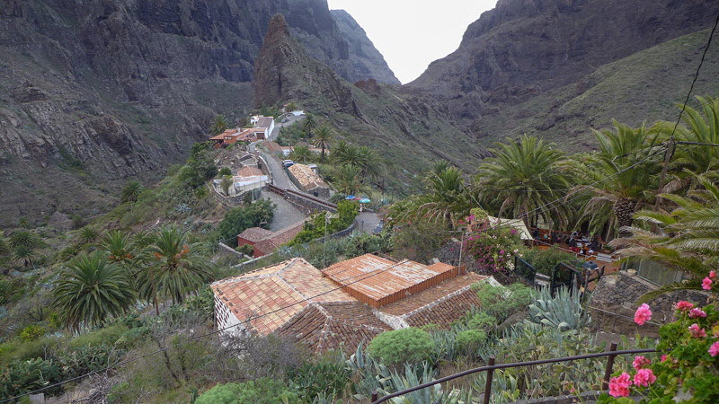 Auf einem Felsrücken, der an einer Felsnadel endet, liegt der mittlere Teil von Masca. Dahinter beginnt die spectakuläre Mascaschlucht, die bis zum Meer hinuntergeht.